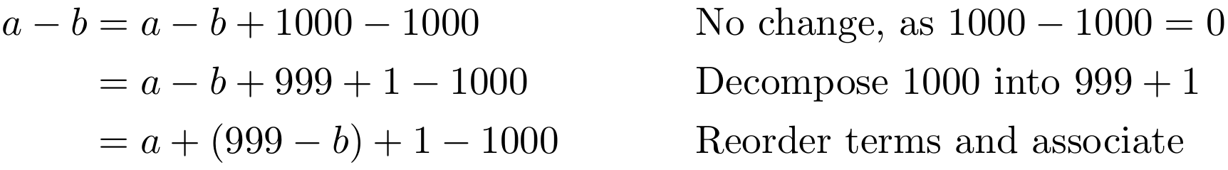 We call the expression 999 – b the nines complement of b. Reframing subtraction using the nines complement is a nice idea, but it only avoids borrowing if a is at least as big as b.