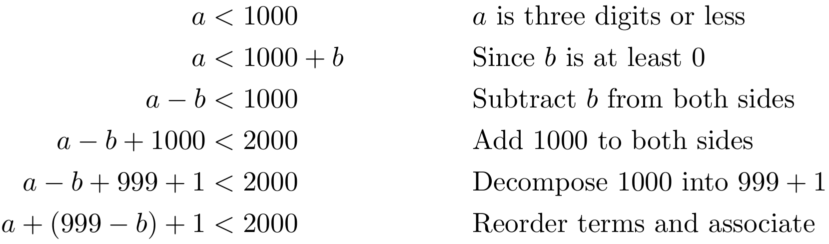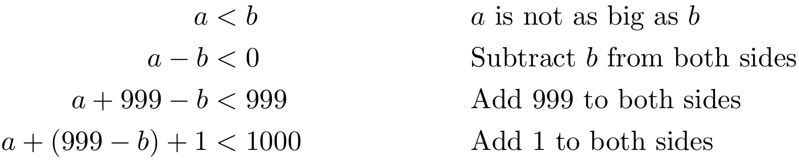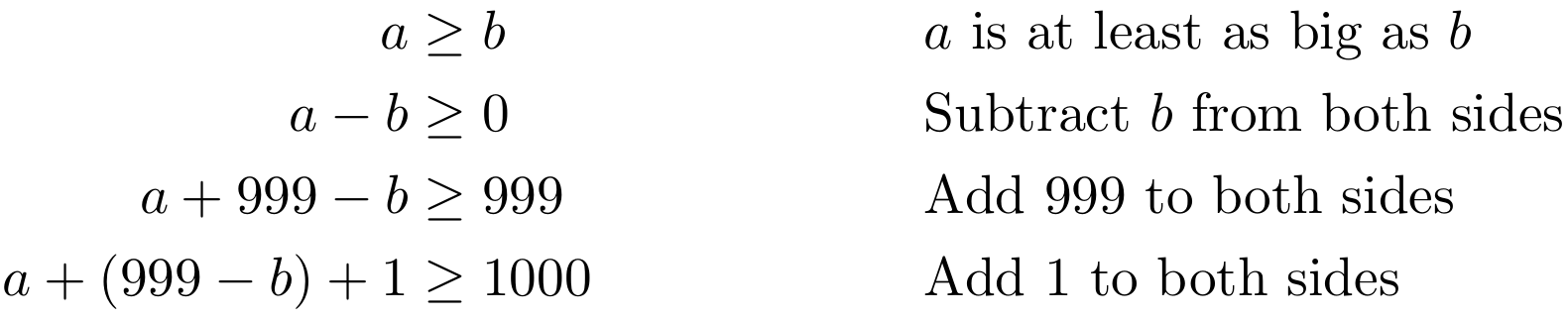 We have replaced one subtraction for two. That may not seem like progress, but we know that 999 – b will require no borrowing. That’s good. But what about the subtraction of 1000? Will that require borrowing? To answer that question, let’s figure out what sort of number a + (999 – b) + 1 is. Let’s break this up into two cases: when a is at least as big as b and otherwise.