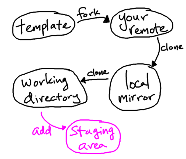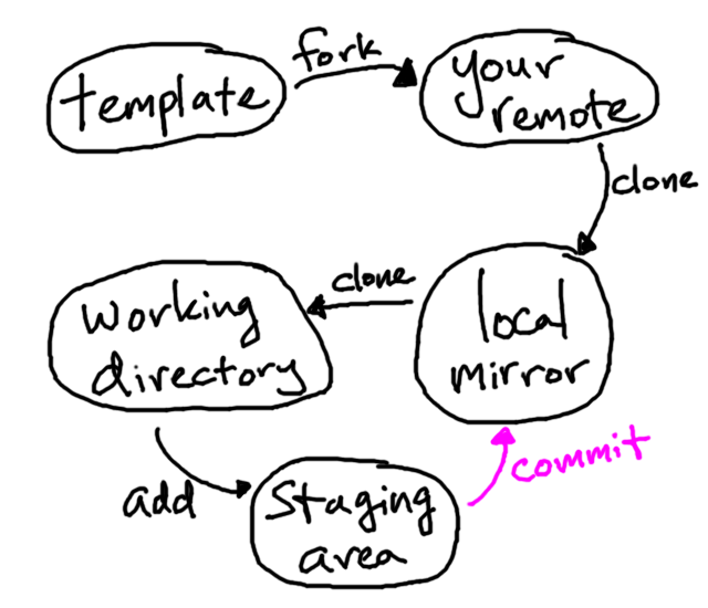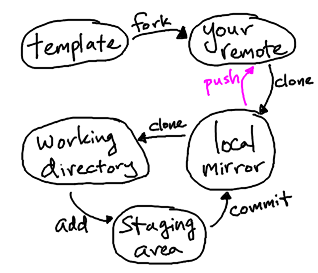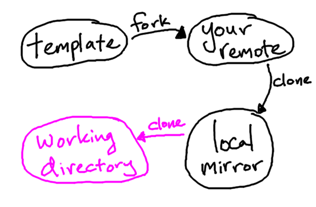 These steps usually only need to be completed once during the semester. If your repository breaks, the fastest path to recovery may be to fork and clone again, migrating over any files from the working directory with the broken repository.