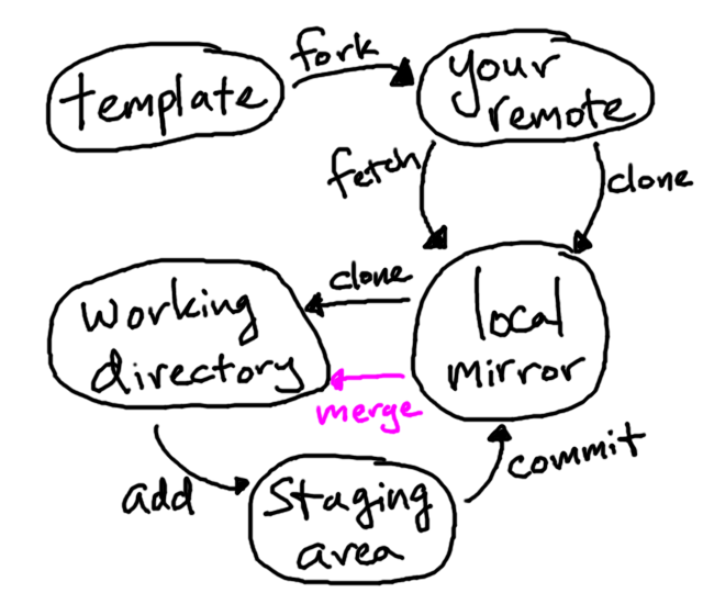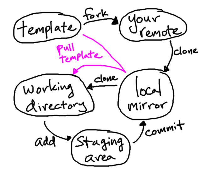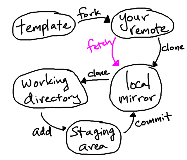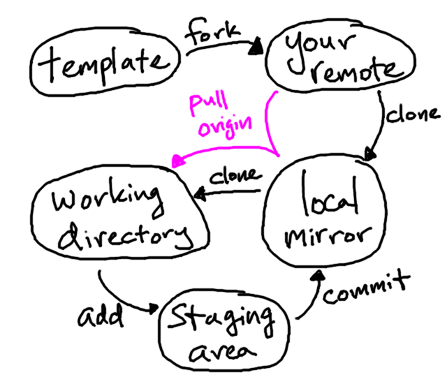 By default, a pull draws from origin, which is your remote repository. Sometimes your instructor issues changes to the template repository, the one you had originally forked. To synchronize your repository with the template, you pull down changes from the template remote, which you added explicitly: