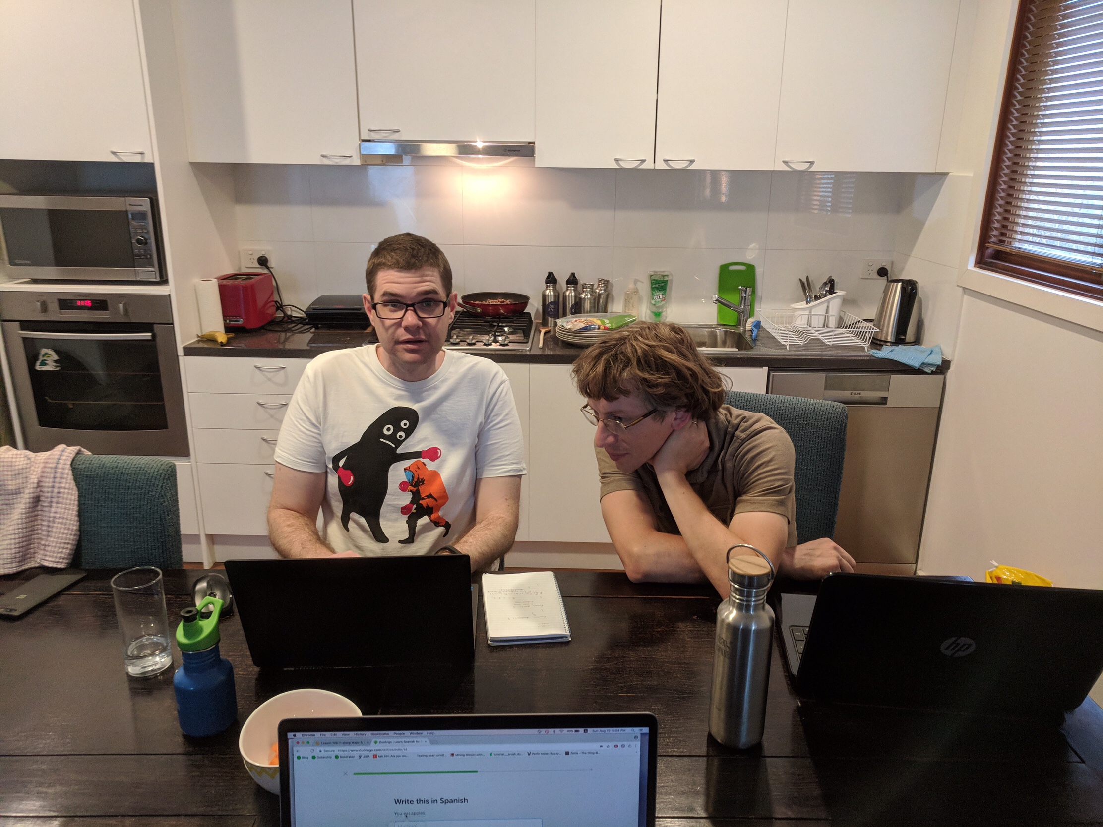 This is Clayton and Chris doing a programming lesson last weekend. It was fun to see Chris get to teach a bit. I am thankful that he gets a break from the intensity of it back home, but he clearly loves it still. It was fun to have Clayton as our first guest in our new home.