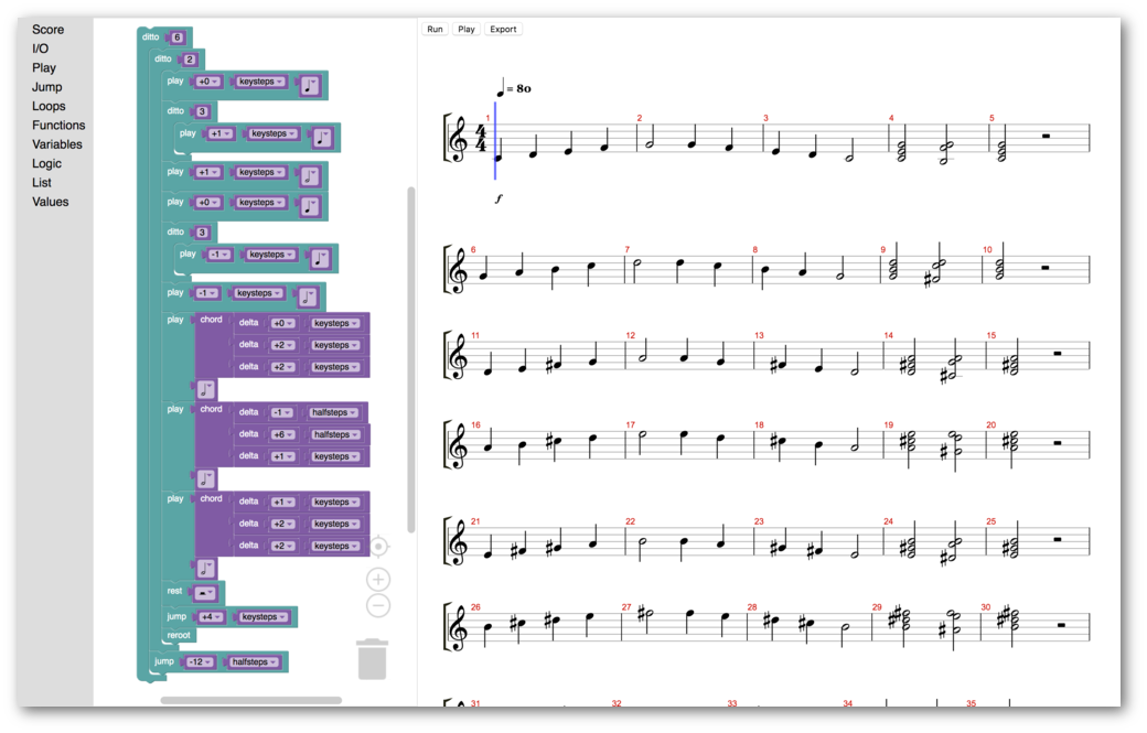 Deltaphone is a blocks-based programming language that extends the relative movement of turtle geometry into music. Composer-programmers express their tunes using intervals or chromatic or diatonic offsets.