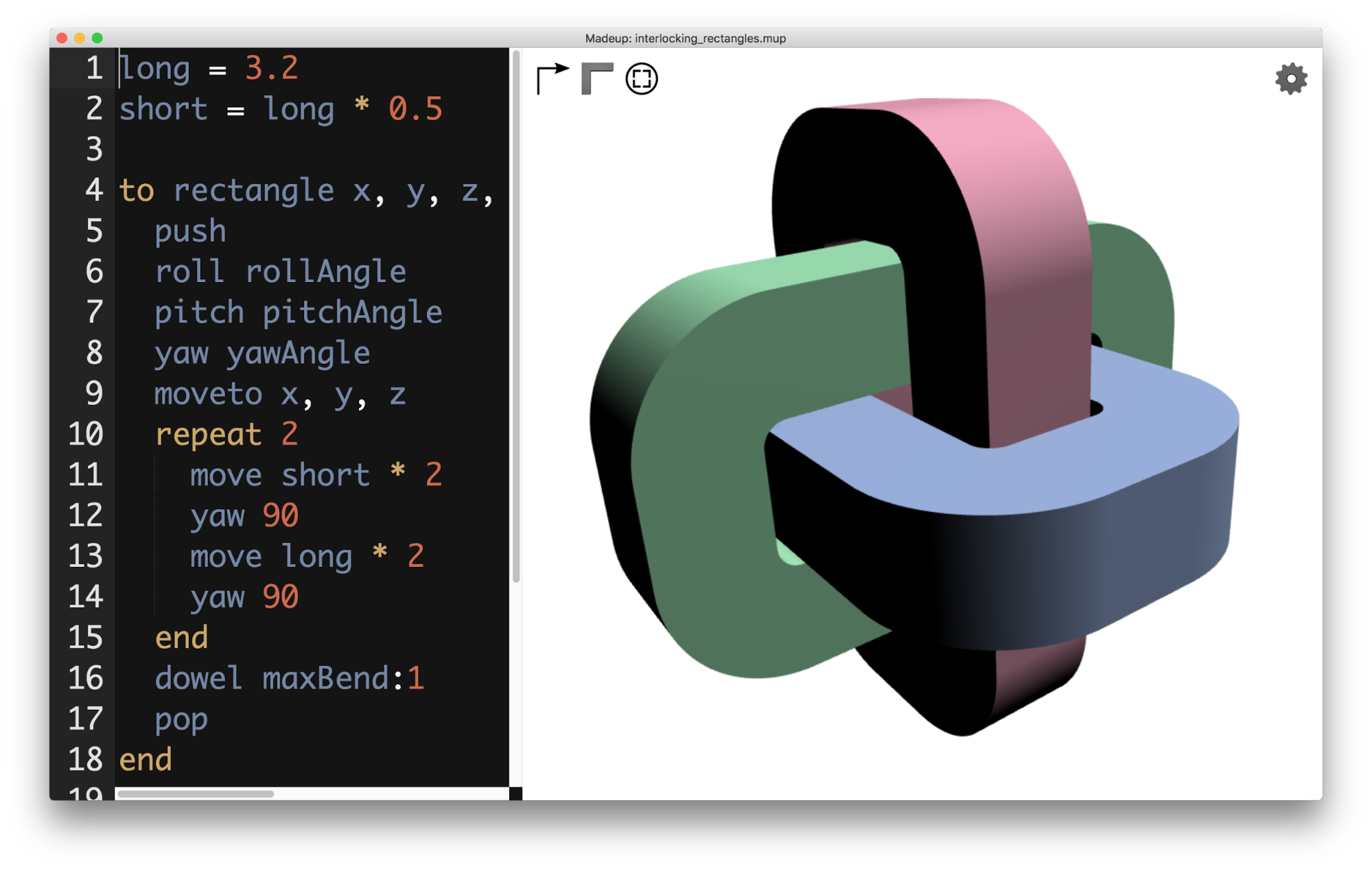 Madeup is a programming language for making things up—literally. Programmers trace out shapes algorithmically and then turn them into solids that can be printed on a 3D printer.